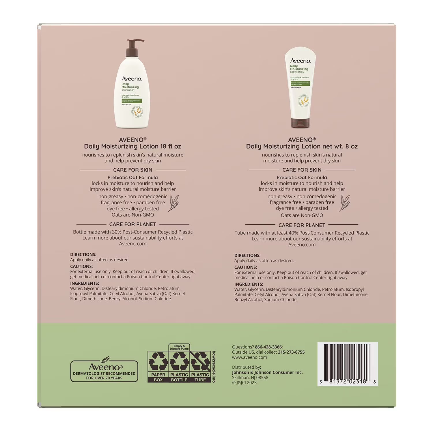 - Includes (2) 18 fl. oz. bottles and (1) 8 oz. traveling tube of Aveeno Daily Moisturizing Body Lotion