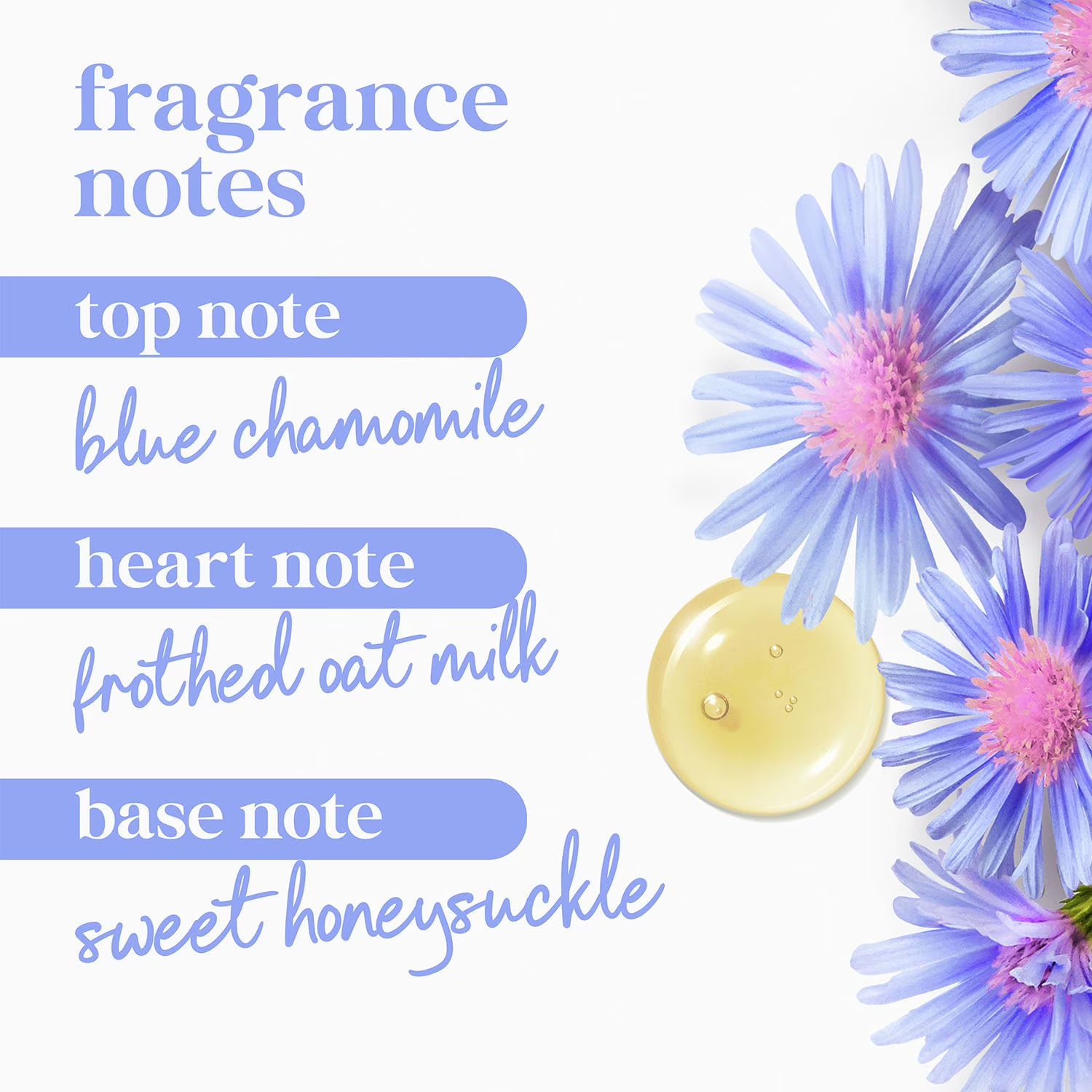Blue Chamomile & Oat Milk: Water (aqua), sodium methyl lauroyl taurate, cocamidopropyl betaine, lauric acid, sodium lauroyl isethionate, sodium hydroxypropyl starch phosphate, hydrogenated soybean oil, sodium chloride, glycine soja (soybean) oil, glycerin, fragrance (parfum), hydrogenated vegetable glycerides, stearic acid, palmitic acid, glyceryl stearate, hydroxystearic acid, chamomilla recutita (matricaria) flower extract, avena sativa (oat) meal extract, sodium benzoate, guar hydroxypropyltrimonium chloride, capryloyl glycine, undecylenolyl glycine, citric acid, sodium gluconate, coumarin, linalool, blue 1 (ci 42090), red 33 (ci 17200), yellow 5 (ci 19140)."