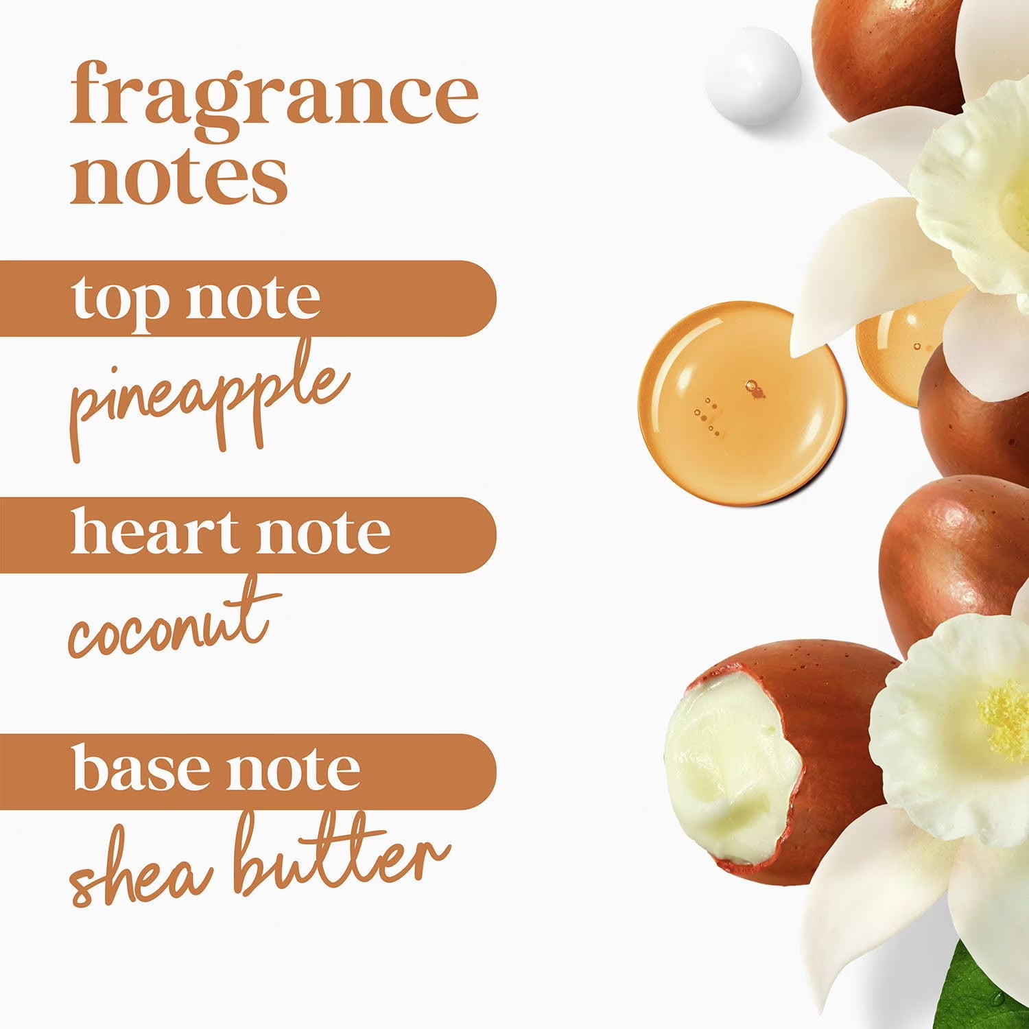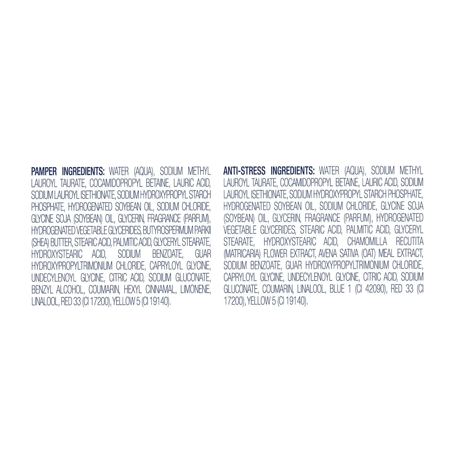 Ingredients: Shea Butter & Vanilla: Water (aqua), sodium methyl lauroyl taurate, cocamidopropyl betaine, lauric acid, sodium lauroyl isethionate, sodium hydroxypropyl starch phosphate, hydrogenated soybean oil, sodium chloride, glycine soja (soybean) oil, glycerin, fragrance (parfum), hydrogenated vegetable glycerides, butyrospermum parkii (shea) butter, stearic acid, palmitic acid, glyceryl stearate, hydroxystearic acid, sodium benzoate, guar hydroxypropyltrimonium chloride, capryloyl glycine, undecylenoyl glycine, citric acid, sodium gluconate, benzyl alcohol, coumarin, hexyl cinnamal, limonene, linalool, red 33 (ci 17200), yellow 5 (ci 19140).