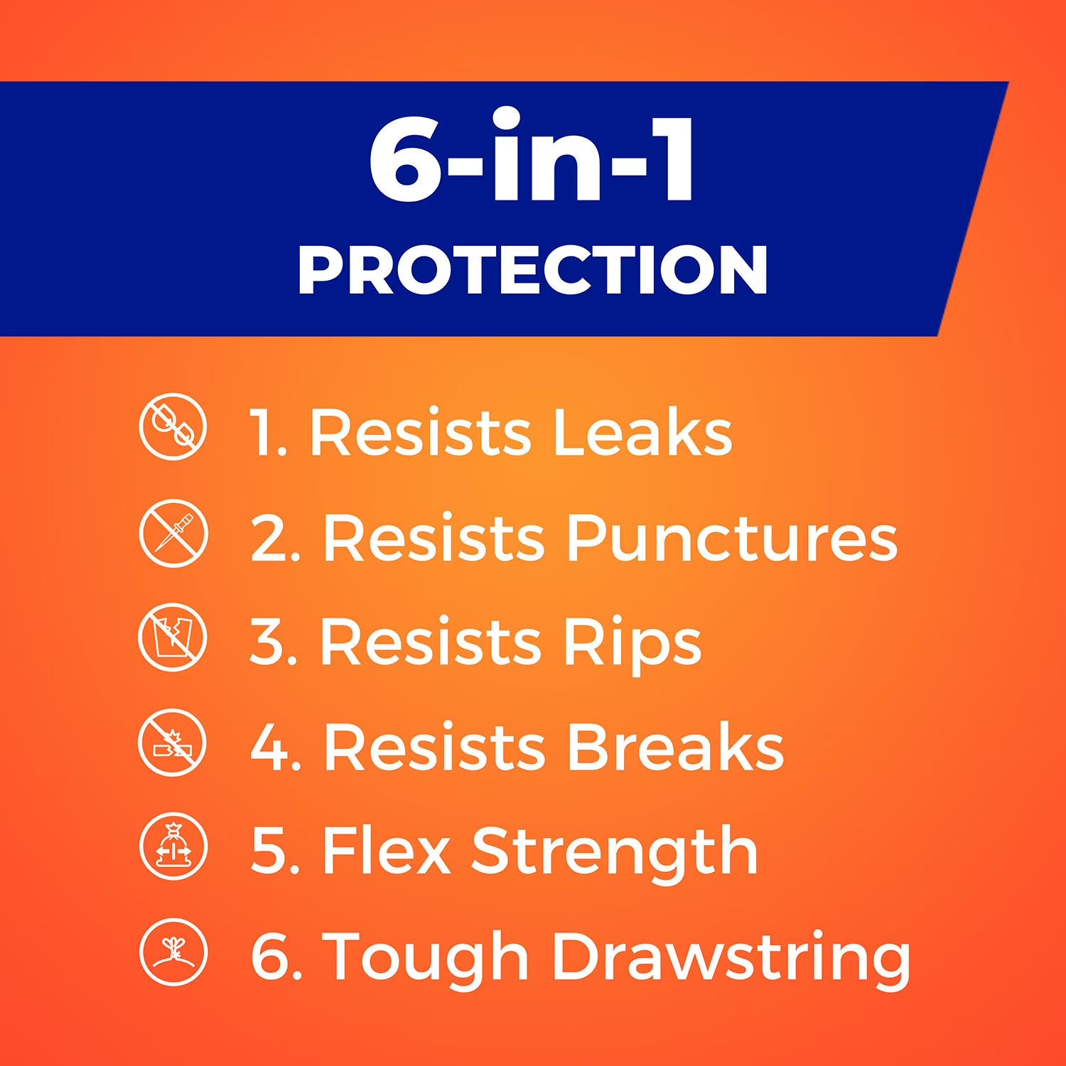 - 6-in-1 protection provides flex strength, secure-fit closure, odor control, and resists leaks, punctures and rips