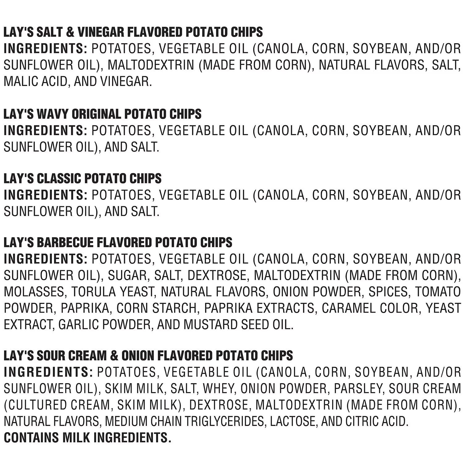 Lay's Sour Cream & Onion Flavored Potato Chips Ingredients: Potatoes, Vegetable Oil (Canola, Corn, Soybean, And/Or Sunflower Oil), Skim Milk, Salt, Whey, Onion Powder, Parsley, Sour Cream (Cultured Cream, Skim Milk), Dextrose, Maltodextrin (Made From Corn), Natural Flavors, Medium Chain Triglycerides, Lactose, And Citric Acid. Contains Milk Ingredients.