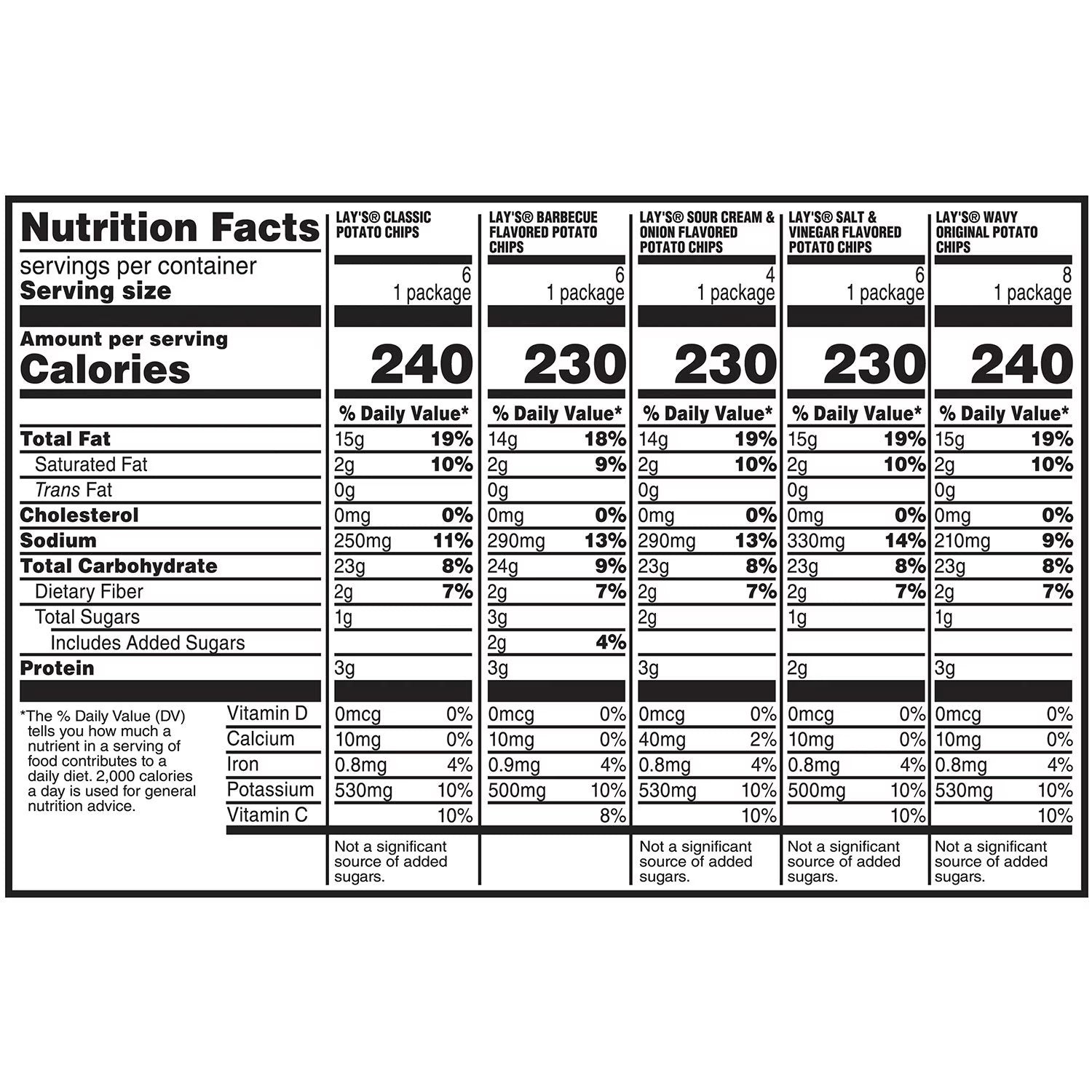 Lay's Classic Potato Chips Ingredients: Potatoes, Vegetable Oil (Canola, Corn, Soybean, And/Or Sunflower Oil), And Salt.