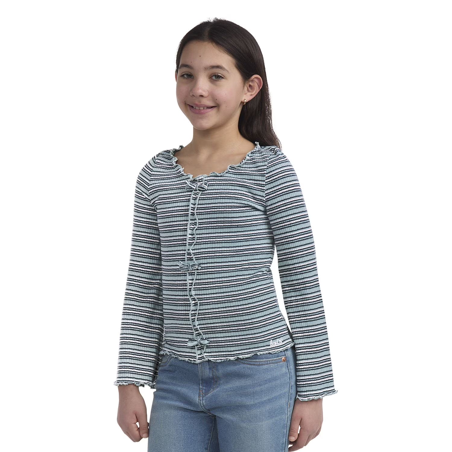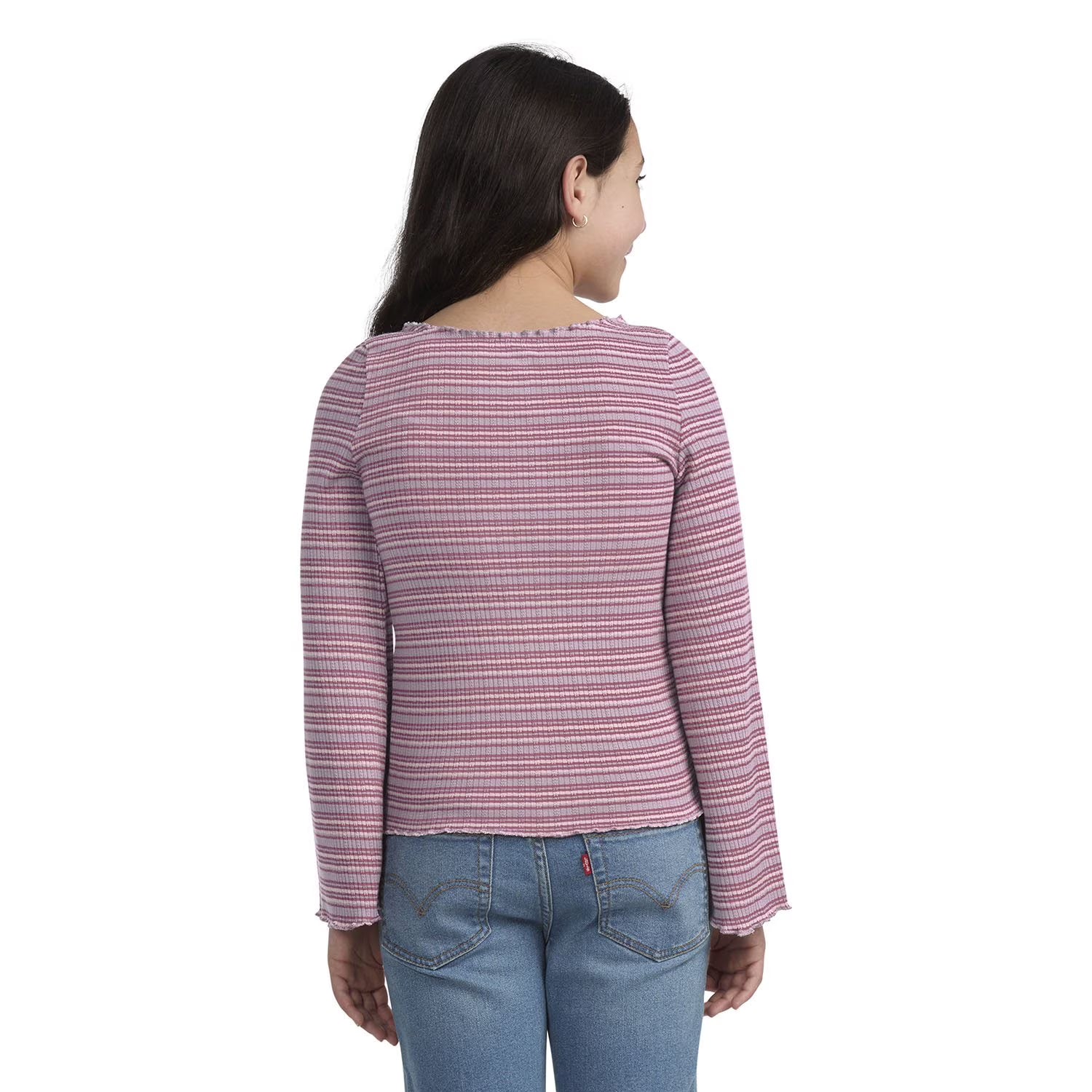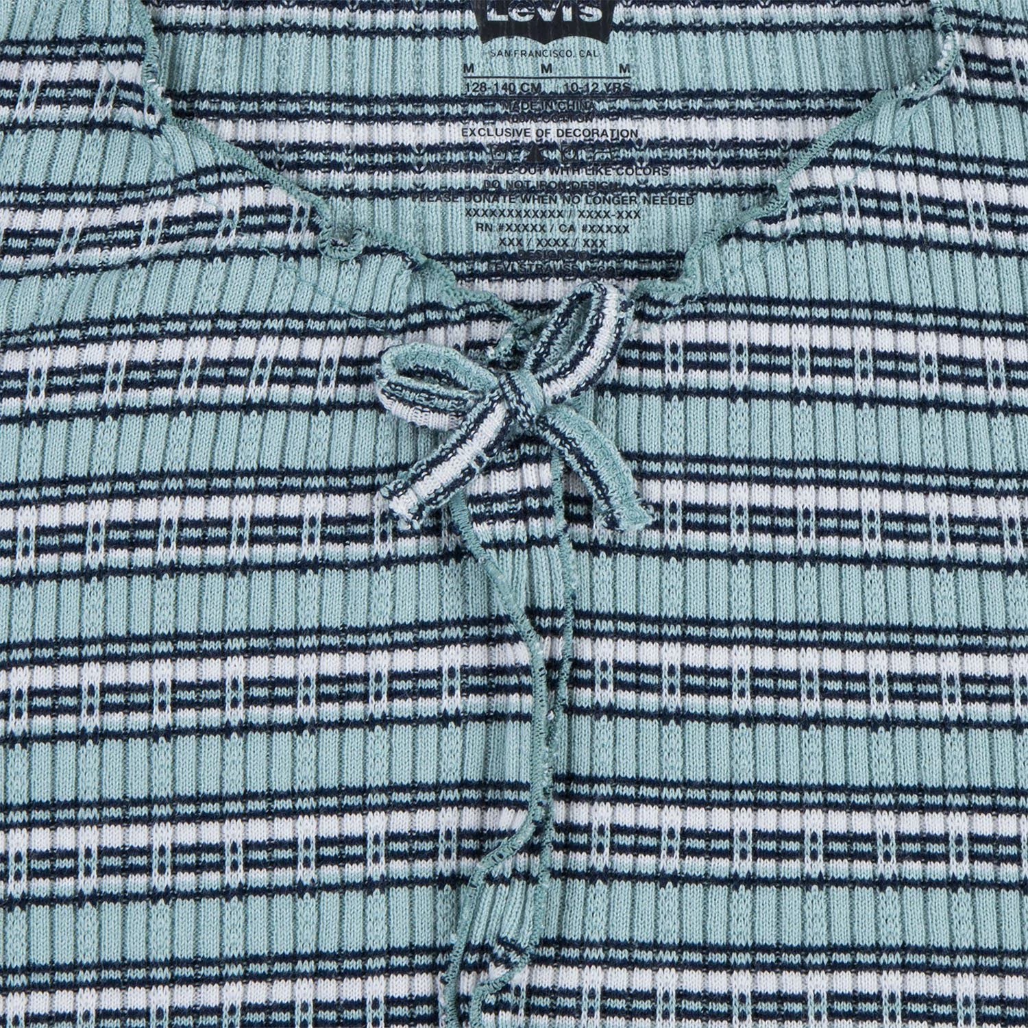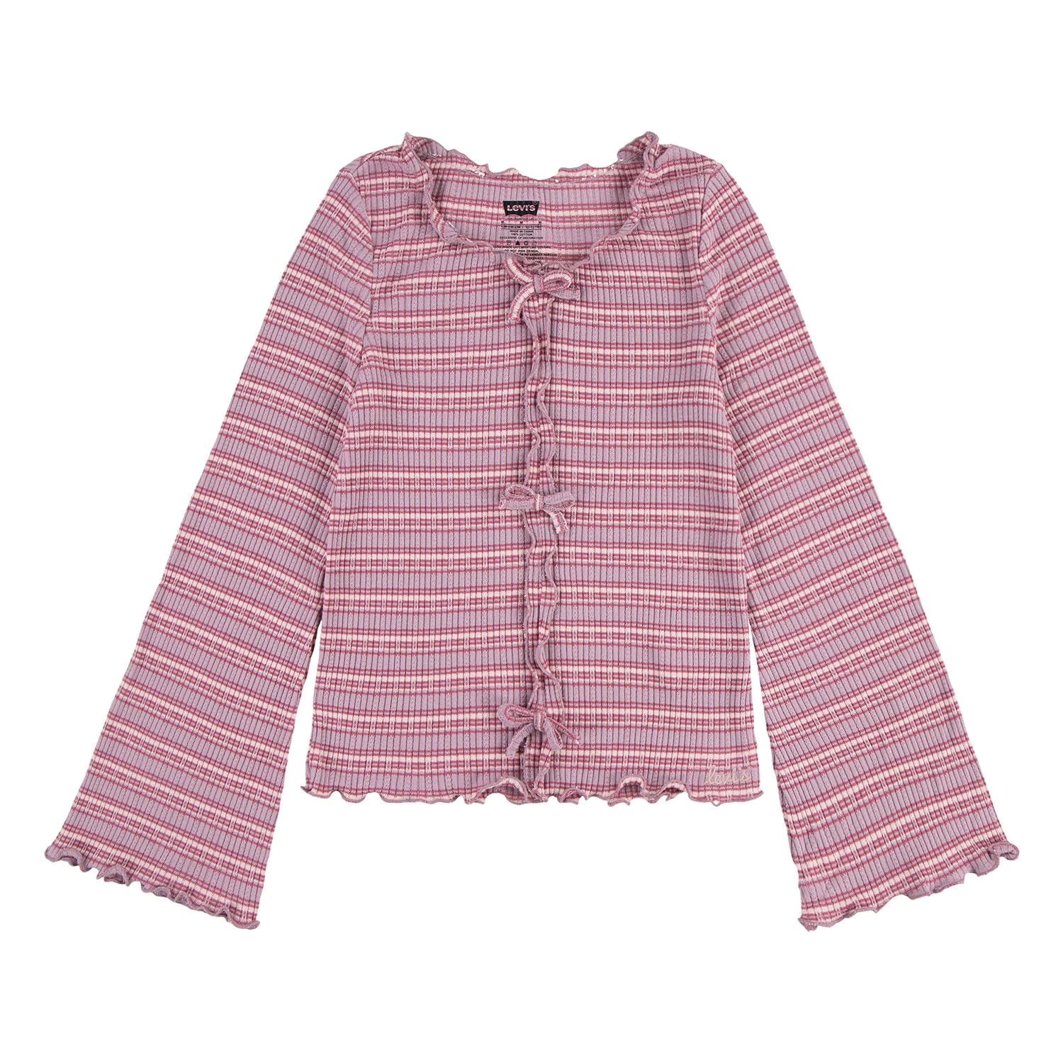 Crafted from striped sweater knit, this Levi's® top will be a playful addition to their wardrobe. Lovely purled trims and front seam with ribbons are the essence of charming vintage style, this top offers comfort and fantastic style without compromising. Featuring an embroidered logo and flattering flared sleeves it offers a playful design that's perfect for school, a date, or lounging around.