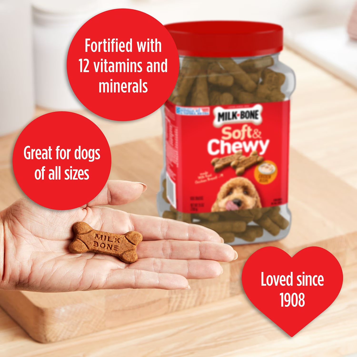 Product Description: One 37 ounce container of Milk-Bone Soft & Chewy Chicken Recipe Dog Treats
