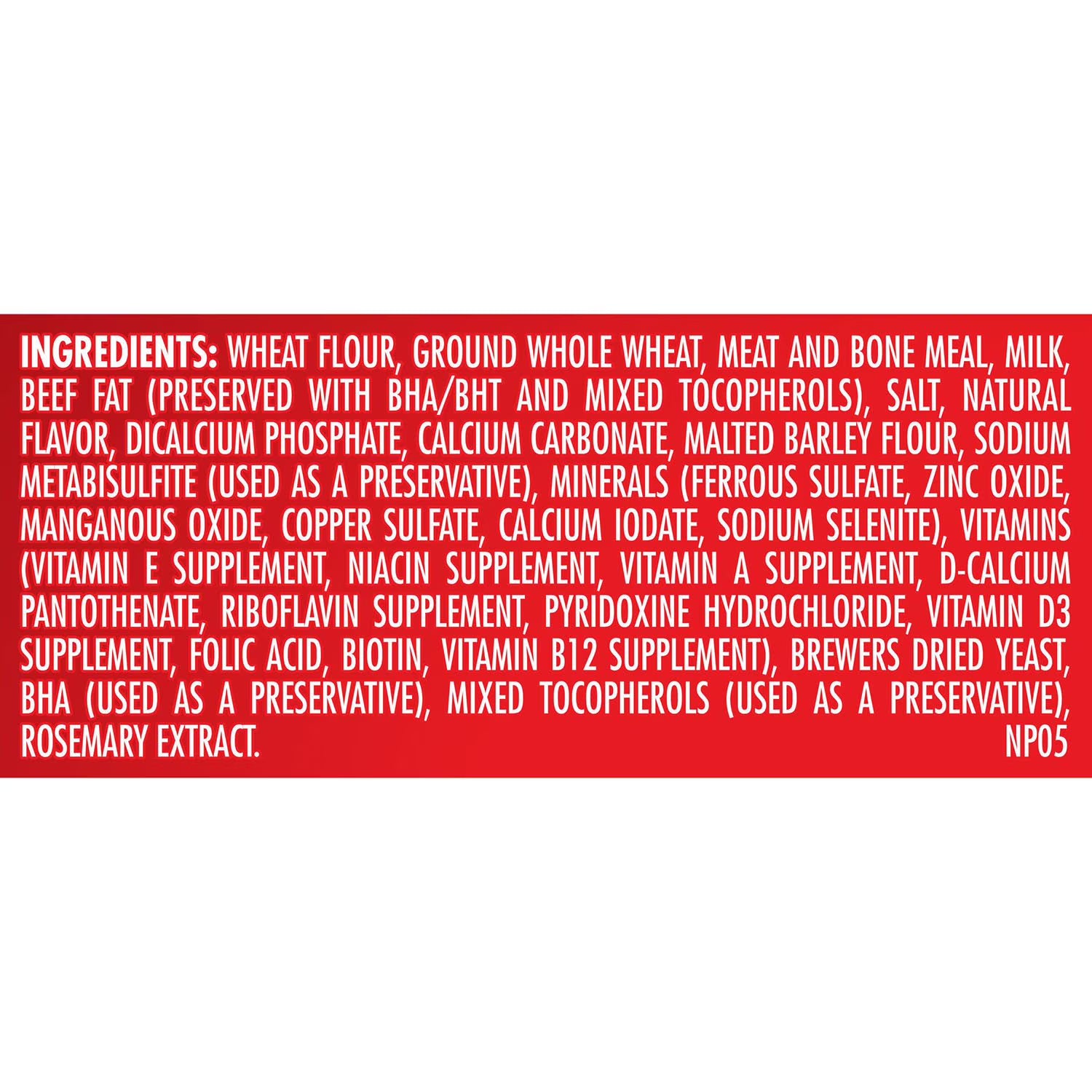 Ingredients List: Ground Whole Wheat, Wheat Flour, Meat And Bone Meal, Milk, Beef Fat (preserved With Bha/bht), Salt, Natural Flavor, Dicalcium Phosphate, Calcium Carbonate, Malted Barley Flour, Brewers Dried Yeast, Sodium Metabisulfite (used As A Preservative), Minerals (ferrous Sulfate, Zinc Oxide, Manganous Oxide, Copper Sulfate, Calcium Iodate, Sodium Selenite), Vitamins (vitamin E Supplement, Niacin Supplement, Vitamin A Supplement, D-calcium Pantothenate, Riboflavin Supplement, Pyridoxine Hydrochloride, Vitamin D3 Supplement, Folic Acid, Biotin, Vitamin B12 Supplement), Bha (used As A Preservative)