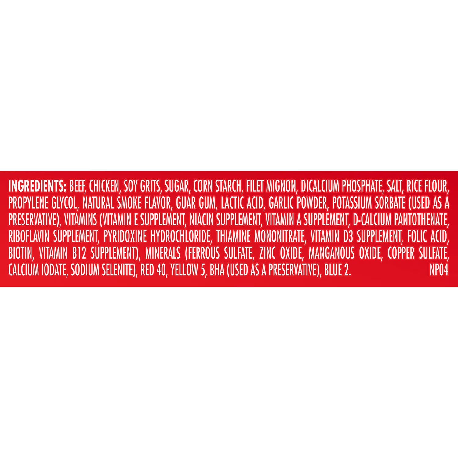 Ingredients List: Beef, Chicken, Soy Grits, Sugar, Corn Starch, Filet Mignon, Chuck Roast, Dicalcium Phosphate, Salt, Natural Smoke Flavor, Propylene Glycol, Rice Flour, Guar Gum, Brewers Rice, Lactic Acid, Garlic Powder, Potassium Sorbate (used As A Preservative), Vitamins (vitamin E Supplement, Niacin Supplement, Vitamin A Supplement, D-calcium Pantothenate, Riboflavin Supplement, Pyridoxine Hydrochloride, Thiamine Mononitrate, Vitamin D3 Supplement, Folic Acid, Biotin, Vitamin B12 Supplement), Minerals (ferrous Sulfate, Zinc Oxide, Manganous Oxide, Copper Sulfate, Calcium Iodate, Sodium Selenite), Red 40, Yellow 5, Bha (used As A Preservative), Blue 2, Papain