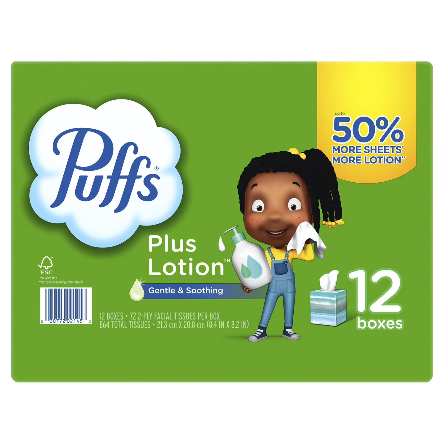 - Pack contains 12 mega cube boxes of Puffs Plus Lotion Facial Tissues
