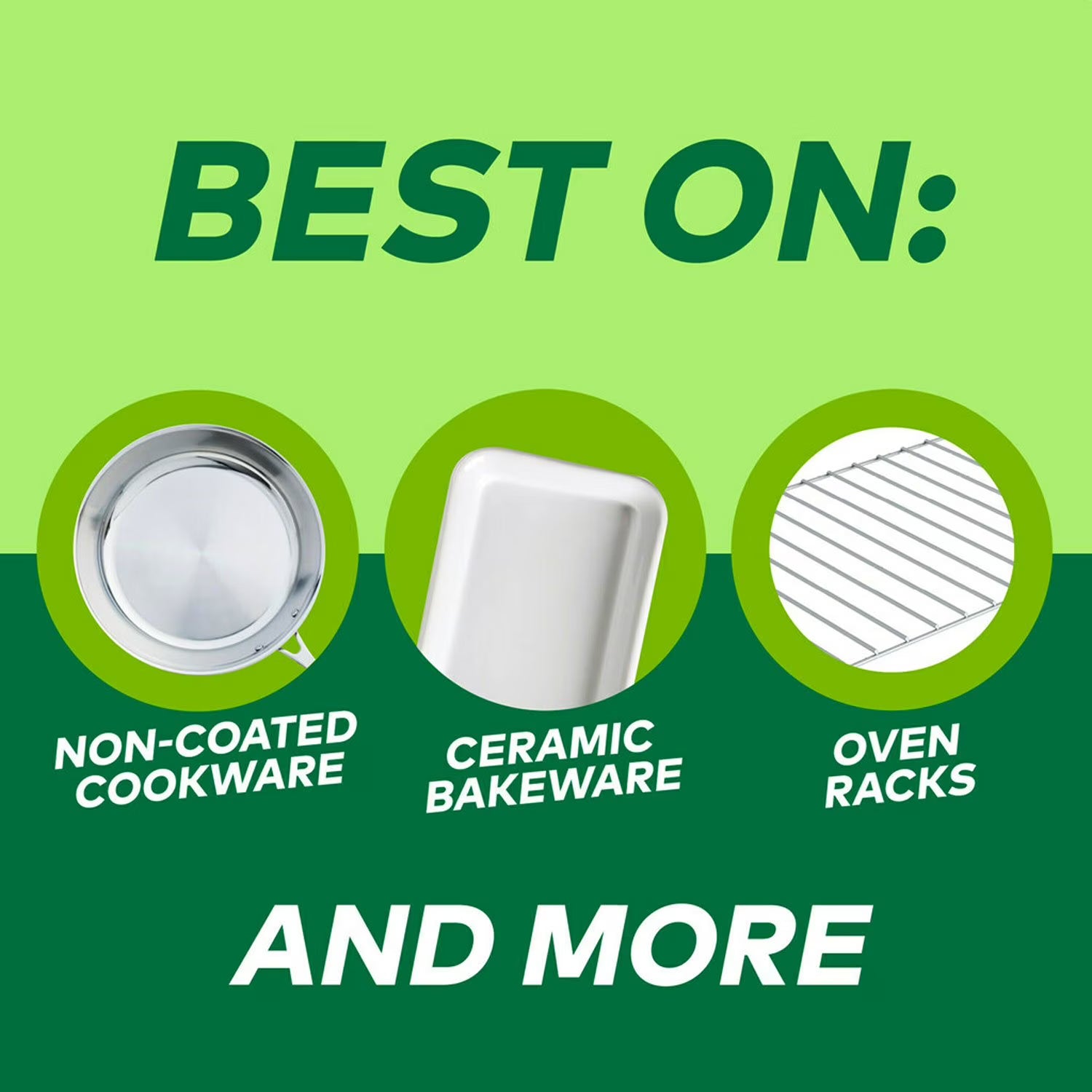 - Safe on non-coated cookware, oven grates, concrete floors, and more