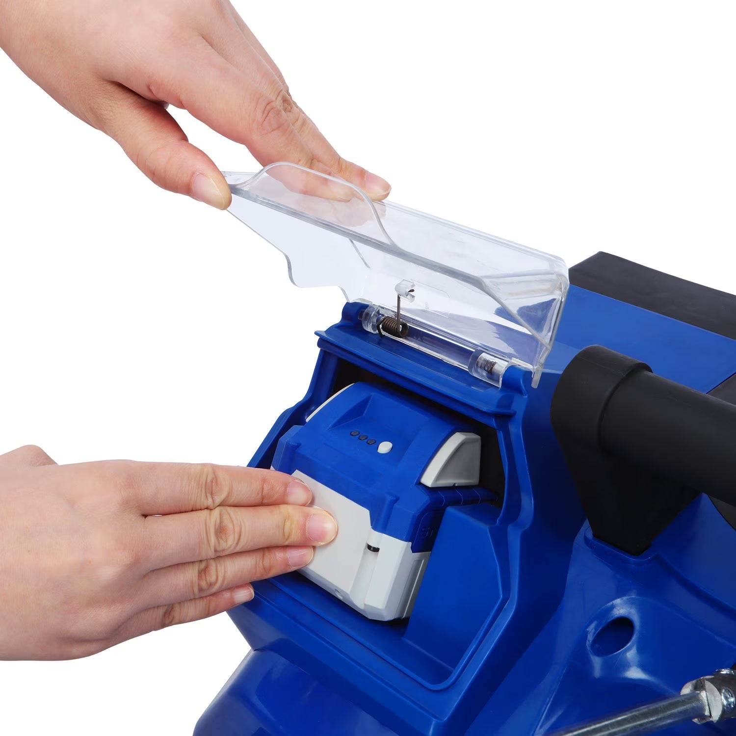 - 1200 W brushless motor clears up to 10 tons of snow per charge