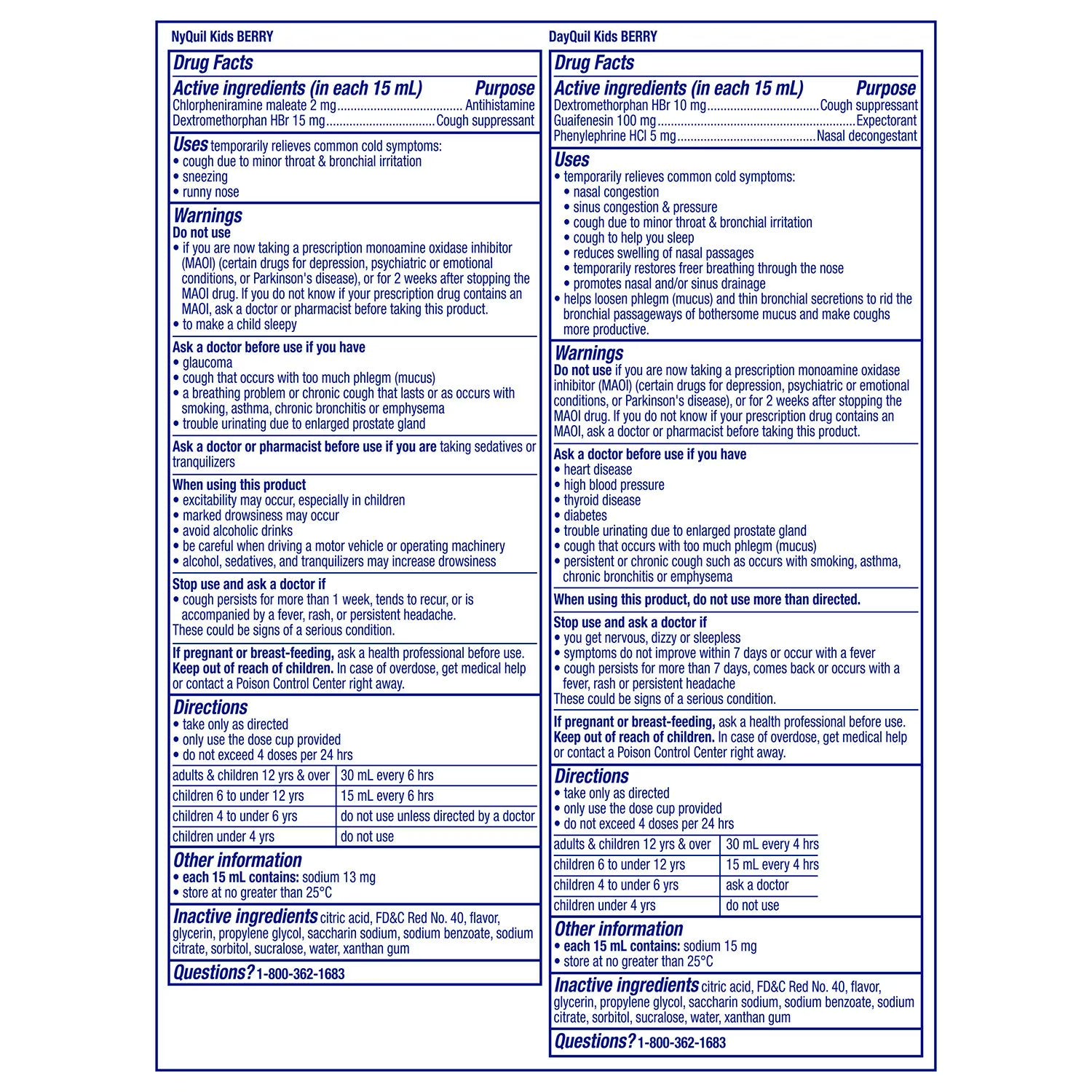 DayQuil Kids Berry: Do not use if you are now taking a prescription monoamine oxidase inhibitor (MAOI) (certain drugs for depression, psychiatric or emotional conditions, or Parkinson's disease), or for 2 weeks after stopping the MAOI drug. If you do not know if your prescription drug contains an MAOI, ask a doctor or pharmacist before taking this product. Ask a doctor before use if you have: heart disease, high blood pressure, thyroid disease, diabetes, trouble urinating due to enlarged prostate gland, cough that occurs with too much phlegm (mucus), persistent or chronic cough such as occurs with smoking, asthma, chronic bronchitis or emphysema. When using this product, do not use more than directed. Stop use and ask a doctor if: you get nervous, dizzy or sleepless, symptoms do not improve within 7 days or occur with a fever, cough persists for more than 7 days, comes back or occurs with a fever, rash or persistent headache. These could be signs of a serious condition. If pregnant or breast-feeding, ask a health professional before use. Keep out of reach of children. In case of overdose, get medical help or contact a Poison Control Center right away.