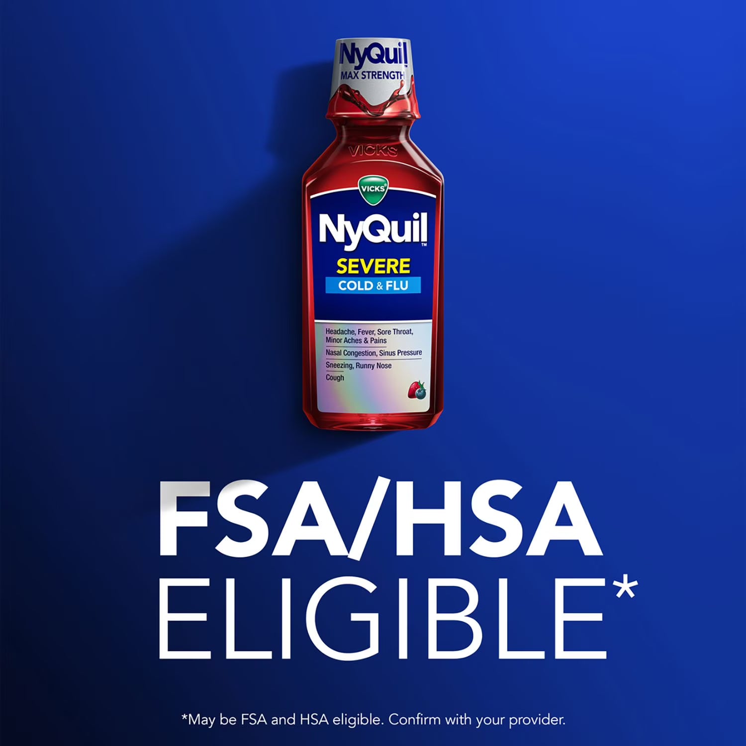 Vicks NyQuil SEVERE provides 9-symptom relief to treat coughing, stuffy nose, minor aches, sneezing, sinus congestion, sinus pressure, sore throat, headache, and fever.