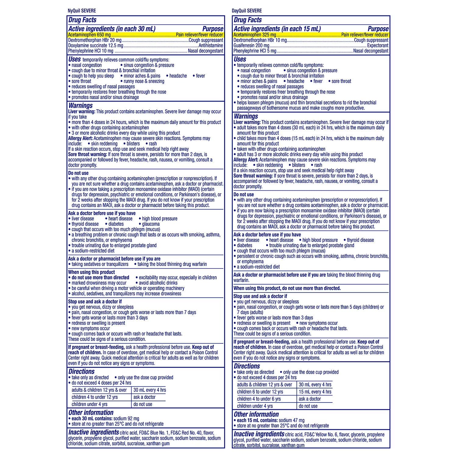 DayQuil: Liver warning: This product contains acetaminophen. Severe liver damage may occur if adult takes more than 4 doses (30 mL each) in 24 hrs., which is the maximum daily amount for this product, Child takes more than 4 doses (15 mL each) in 24 hrs., which is the maximum daily amount for this product, Taken with other drugs containing acetaminophen. Adult has 3 or more alcoholic drinks every day while using this product. Sore throat warning: If sore throat is severe, persists for more than 2 days, is accompanied or followed by fever, headache, rash, nausea, or vomiting, consult a doctor promptly.